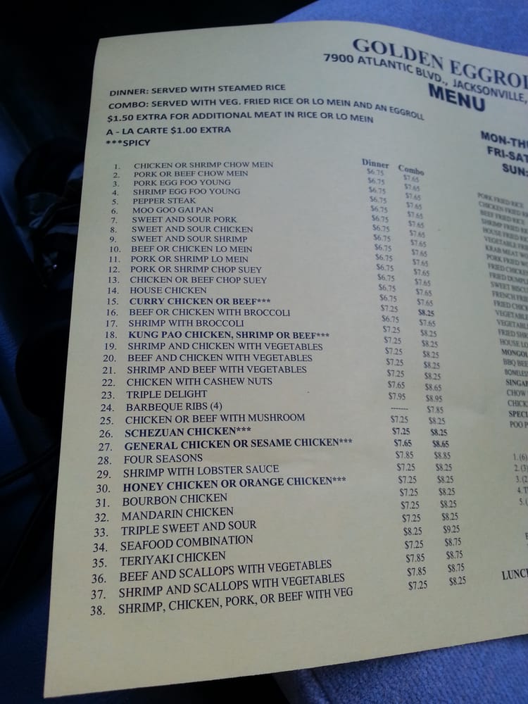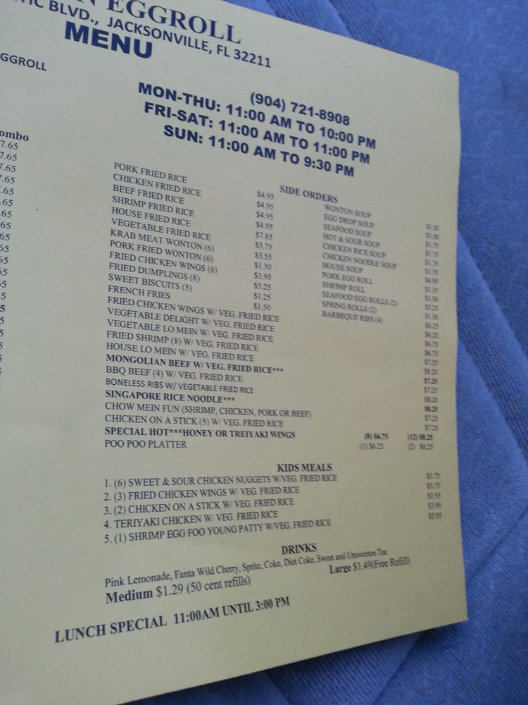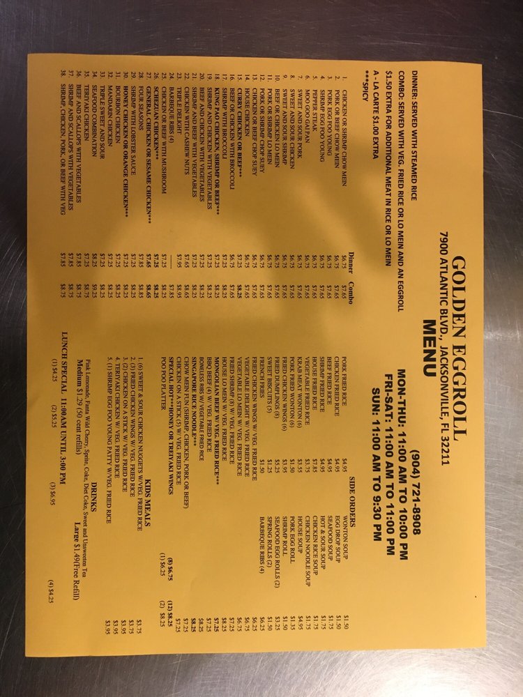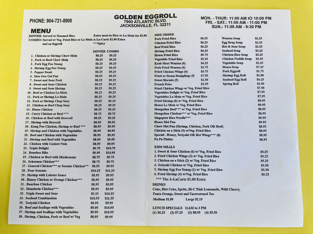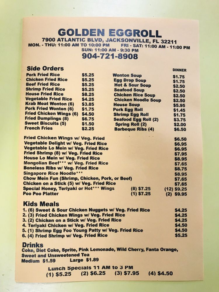 Golden Eggroll is a Chinese restaurant located in Jacksonville, FL, offering a variety of appetizers, soups, and dinner options. Their menu includes classics like Pork Egg Foo Young, Sweet and Sour Chicken, and Kung Pao Shrimp. The restaurant provides delivery, takeout, and catering services, making it convenient for customers. The cozy ambiance and gender-neutral restrooms make it inclusive for all diners. The extensive menu caters to different preferences, from spicy options like Hot Wings to milder dishes like Beef with Broccoli. The Krab Meat Wontons and House Chicken are must-try dishes, showcasing the restaurant's flavorful offerings. Golden Eggroll's commitment to quality ingredients and attentive service make it a standout choice for Chinese cuisine in the area.
