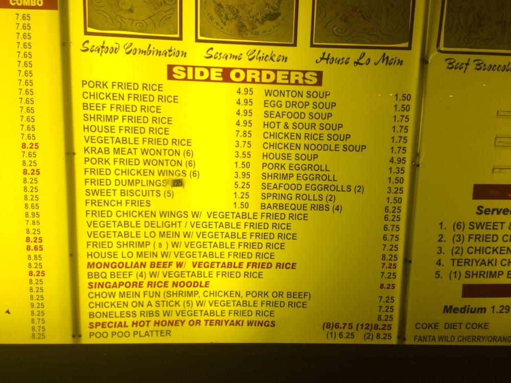 Fried Chicken, Fried Shrimp, Krab meat wonton, chicken on a stick and Eggroll
